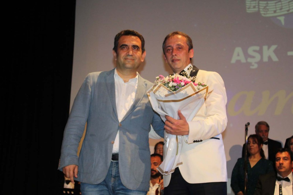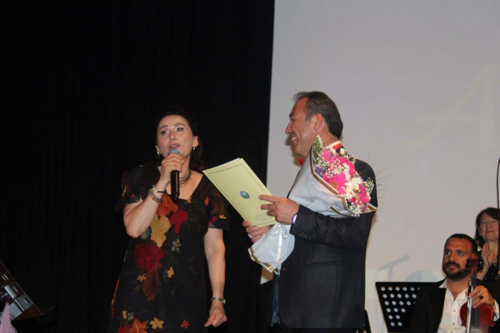 Gecenin sunumu üstlenen ve başarıyla tamamlayan Ermiş’in çiçeğini de korist Süreyya Şirin verdi.