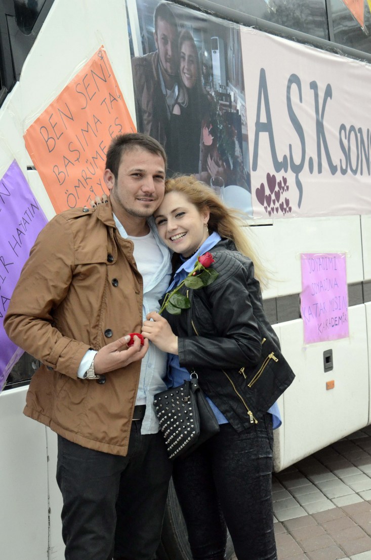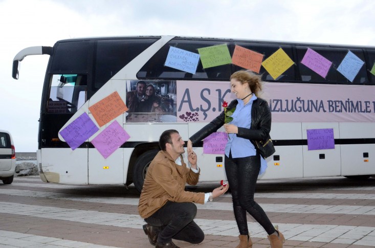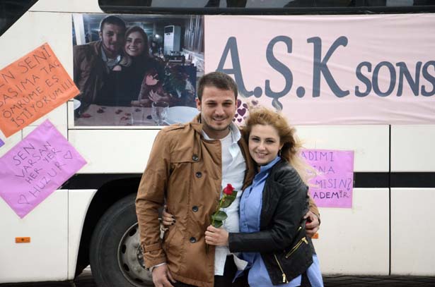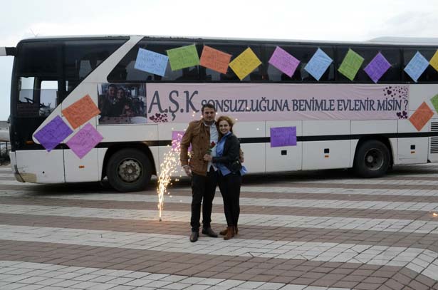 Zonguldak kent merkezinde esnaflık yapan 29 yaşındaki Adem Karademir, 3 aydır birlikte olduğu kız arkadaşı 23 yaşındaki Şeydanur Hoşbaş'a evlilik teklifi için iki hafta öncesinden hazırlıklara başladı. Bir süre arkadaşlarıyla birlikte ilginç bir evlilik teklifi için fikir alışverişinde bulunan Karademir, "Aşk Otobüsü" yapmaya karar verdi. Kiraladığı yolcu otobüsünün yan bölmesine fon kartonlarıyla aşk sözleri yazan Karademir, 10 metre uzunluğundaki pankarta da "Aşk Sonsuzluğuna Benimle Evlenir Misin?" yazdırdı.