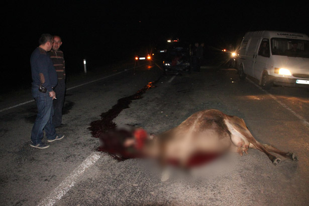 Otomobilin çarptığı inek ölmek üzereyken vatandaşlar tarafından olay yerinde kesildi. Köy sakinlerinden Selçuk Öztürk "Asker uğurlamasından dönen 4 arkadaşın aracı, yolun ortasında bulunan hayvana çarpıp hayvanı yaklaşık 10 metre geriye itmiş. Araç olduğu yerde sabit olarak kalmış. Yaralılar ambulansla hastaneye kaldırıldı. Jandarmanın gelmesi bekleniyor." dedi.