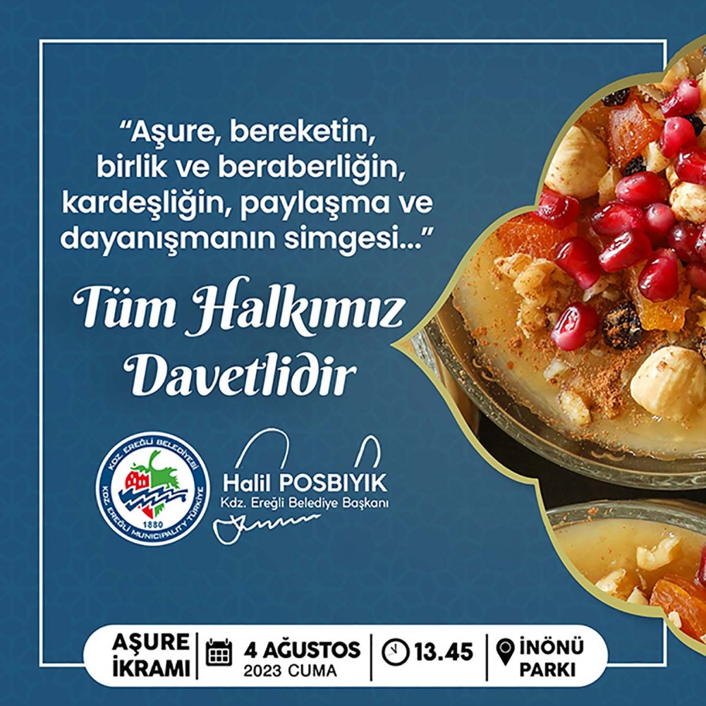 Kdz. Ereğli Belediyesi tarafından Muharrem ayı dolayısıyla Cuma günü saat 13.45’de İnönü Parkında vatandaşlara aşure dağıtacak.