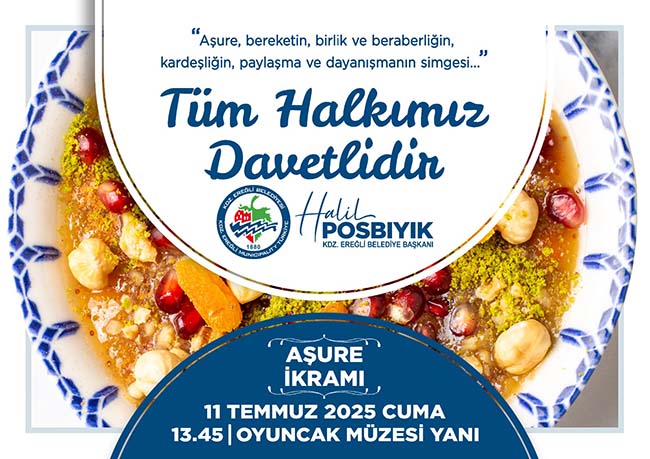 Kdz. Ereğli Belediyesi tarafından Muharrem ayı dolayısıyla 11 Temmuz Cuma günü saat 13.45’de İnönü Parkı’nda vatandaşlara aşure dağıtacak.