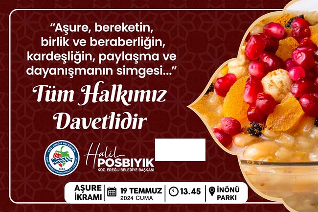 Kdz. Ereğli Belediyesi tarafından Muharrem ayı dolayısıyla Cuma günü saat 13.45’de İnönü Parkı’nda vatandaşlara aşure dağıtacak.