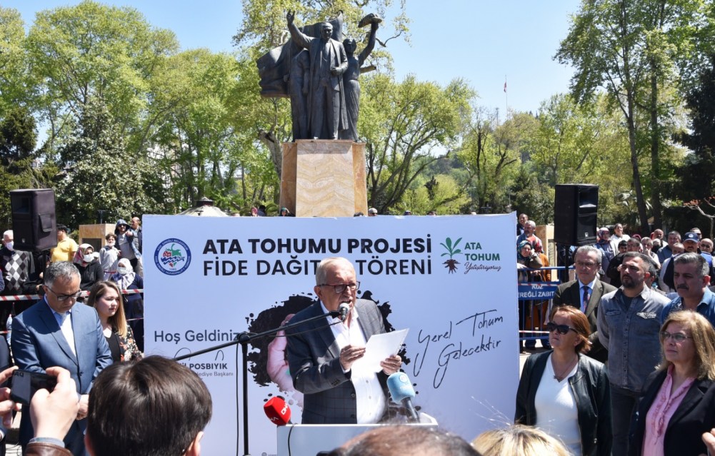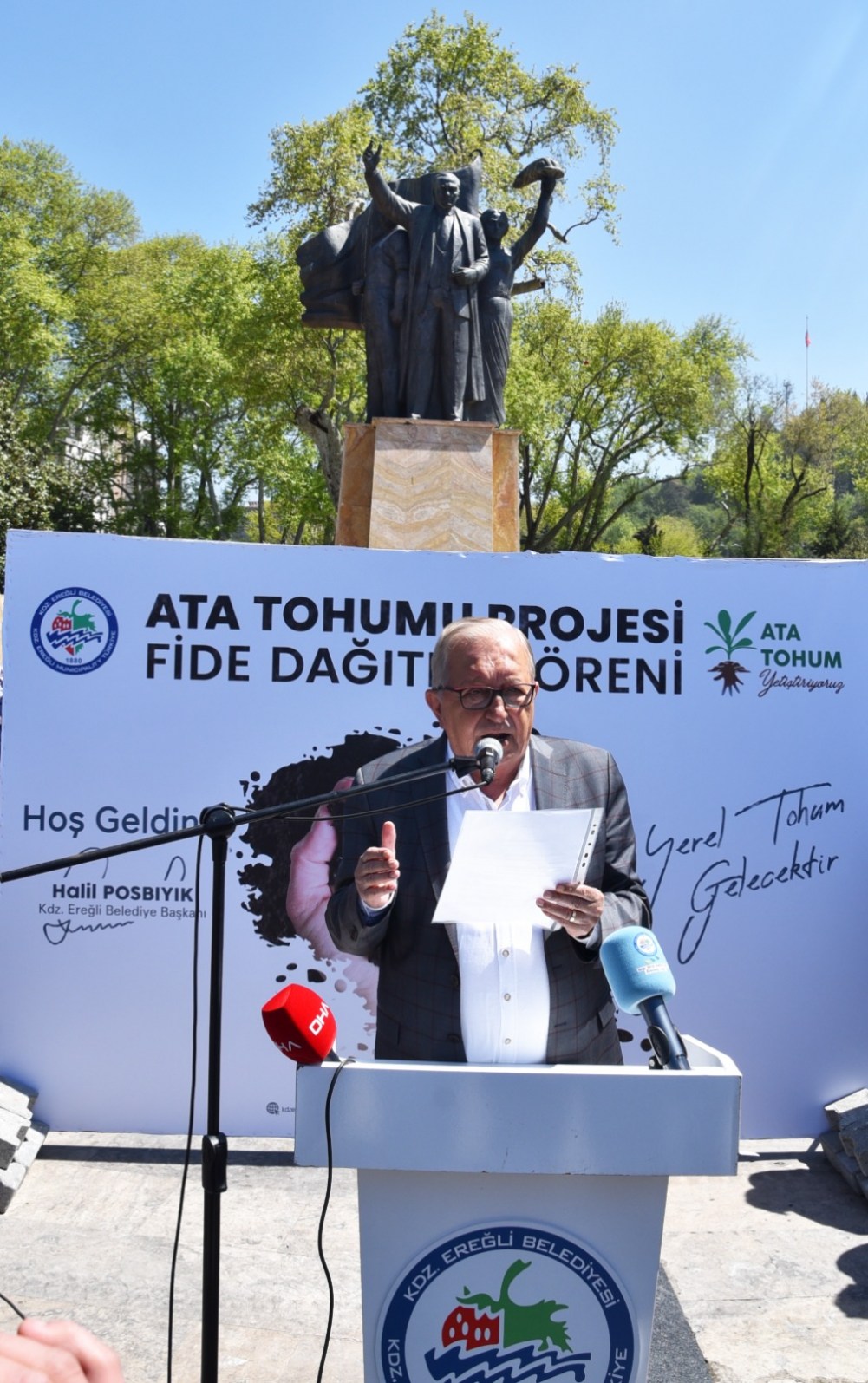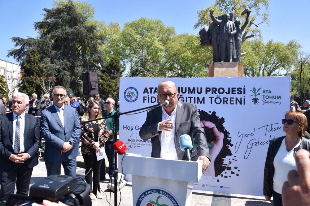 Bu yıl size 100 domates, biber, patlıcan ve salatalık fidesi dağıtıyoruz. Bu fideleri sizler istediğiniz kadar çoğaltabilirsiniz. Günümüz koşullarında, tarlası olmayan bir insan dahi evinin balkonunda, hobi bahçelerinde bu fideleri çoğaltabilir. Bu ülkede tarımın güçlenmesi için Kdz. Ereğli Belediyesi olarak kendi çapımızda elimizden gelen gayreti gösteriyoruz. Bir çok üniversite, ata tohumuna ulaştığımız için bu fidelerden istiyor. Üniversitelere de katkı vermeye çalışıyoruz ve ürettiğimizi halkımızla paylaşıyoruz. Sizden tek ricamız, bu fidelerden aldığınız ürünlerden sonra tohumlarını çoğaltın ve lütfen komşularınıza, dostlarınıza verin, çevrenizle paylaşın. Bu bizim milli görevimiz.”