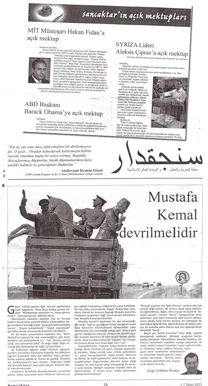 Merkezi İstanbul da bulunan "Hürriyet, Adalet, İttiad-ı İslam SANCAKTAR" adlı Türkiye genelinde dağıtılan Haftalık yayın organında MUSTAFA KEMAL DEVRİLMELİDİR başlıklı yazılarında, Atamızın manevi şahsiyetine saldırı ve hakaretler yapıldığını ulusal basınımızdan öğrenmiş bulunuyoruz. Söz konusu dergi Anıtkabir'in yunan tapınağına benzediği savı ile yıkılması isteğini içeren Çevre ve Şehircilik Bakanlığına yazdığı mektubunu da alenen dergide yayınladığı görülmektedir. Türkiye genelinde bir yayın olduğundan Konu hakkında gerek genel merkezimiz gerekse diğer şubelerimiz bilgilendirilmiş olup, genel merkezimiz ile birlikte eş güdüm içerisinde gereken kanuni takip ve müdahale süreci devam etmektedir.