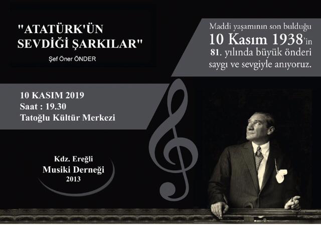 Türkiye Cumhuriyeti’nin kurucusu Gazi Mustafa Kemal Atatürk’ün aramızdan ayrılışının 81. Yıl dönümü dolayısıyla, Ereğli Musiki derneği tarafından "Atatürk’ün sevdiği şarkılar" temalı "10 Kasım Atatürk’ü anma program!" gerçekleştirilecek.