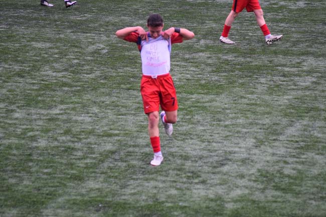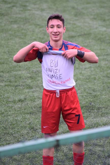 Zonguldak'ta amatör futbolcu ve aynı zamanda hafızlık öğrencisi olan Tarık Selman Erik (15), attığı 2 gol sonrasında sevincini formasının altındaki 'Bu hafızı kimse durduramaz' yazısının bulunduğu tişörtü açarak kutladı.