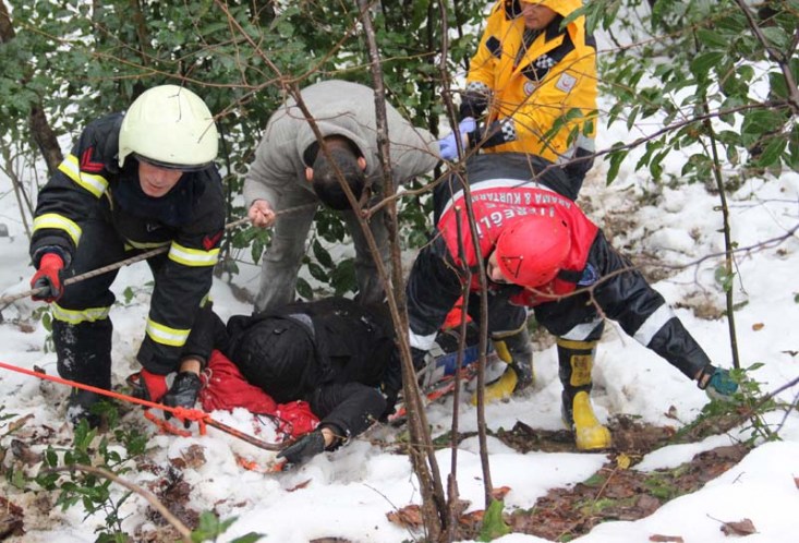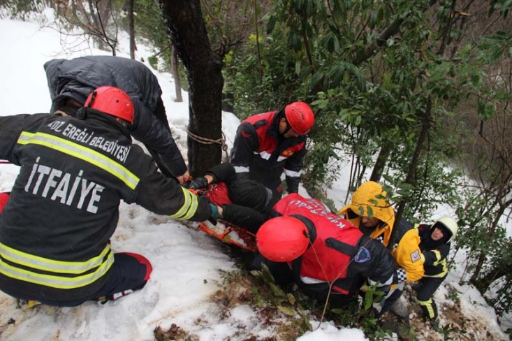 Olay ilçeye bağlı Balık mahallesi Aktaş sokakta meydana geldi. İddiaya göre 36 yaşındaki Yücel Emir, avlanmak için evden çıktı. Dağlık alanda yürüdüğü sırada karda dengesini kaybederek dere yatağına yuvarlandı. Ayağı kırılan avcı Yücel Emir, yakınlarından kendisini kurtarmaları için yardım istedi. Yücel Özdemir'in akrabaları gösterdikleri çabaya rağmen kendi imkanları ile Emir'i kurtaramayacaklarını anlayınca itfaiye ve 112 ekiplerinden yardım istedi. Olay yerine gelen itfaiye ekipleri, yoldan yaklaşık 500 metre mesafede dere yatağına düşen Yücel Emir'i kurtarmak için çalışma başlattı. İplerle dere yatağına inen itfaiye ve sağlık ekipleri, Yücel Emir'e ilk müdahaleyi yaptıktan sonra sedyeye yatırarak yukarıya çekmeye başladı. Zorlu kurtarma çalışması sonrasında yola çıkarılan Yücel Emir, ambulansa alınarak Ereğli Devlet Hastanesine kaldırıldı. Yücel Emir'in yakını "Bizi telefonla aradı. Ava çıkmış galiba. Biz kendi imkanlarımızla çıkaramadık. İtfaiyeden yardım istedik" dedi.