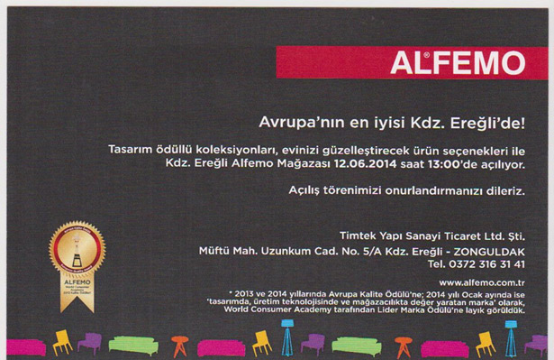 2013 ve 2014 yıllarında Avrupa Kalite Ödülüne; 2014 yılı Ocak ayında tasarımda, üretim teknolojisinde ve mağazacılıkta değer yaratan marka olarak, World Consumer Academy tarafından Lider Marka Ödülüne layık görülen Alfemo Karadeniz Ereğli'de halkın hizmetine açılıyor.