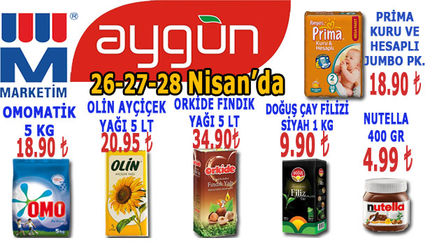 Aygün Market 26- 27- 28 Nisan tarihleri arasında indirimli ürünleriyle Ereğli halkını alışverişe davet ediyor.