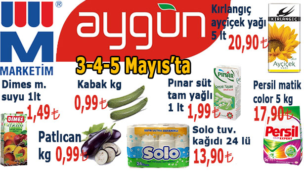 Aygün Market 03- 04- 05 tarihleri arasında indirimli ürünleriyle Ereğli halkını alışverişe davet ediyor.