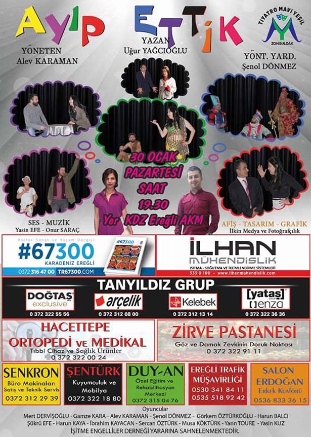 Tiyatro Mavi Yeşil'in tarafından organize edilen Uğur Yağcıoğlu'nun yazdığı, Alev Karaman'ın yönettiği, Şenol Dnmez'in yönetmen yardımcılığını yaptığı 'Ayıp Ettik' isimli tiyatro oyunu ,için son hazırlıklar devam ediyor.