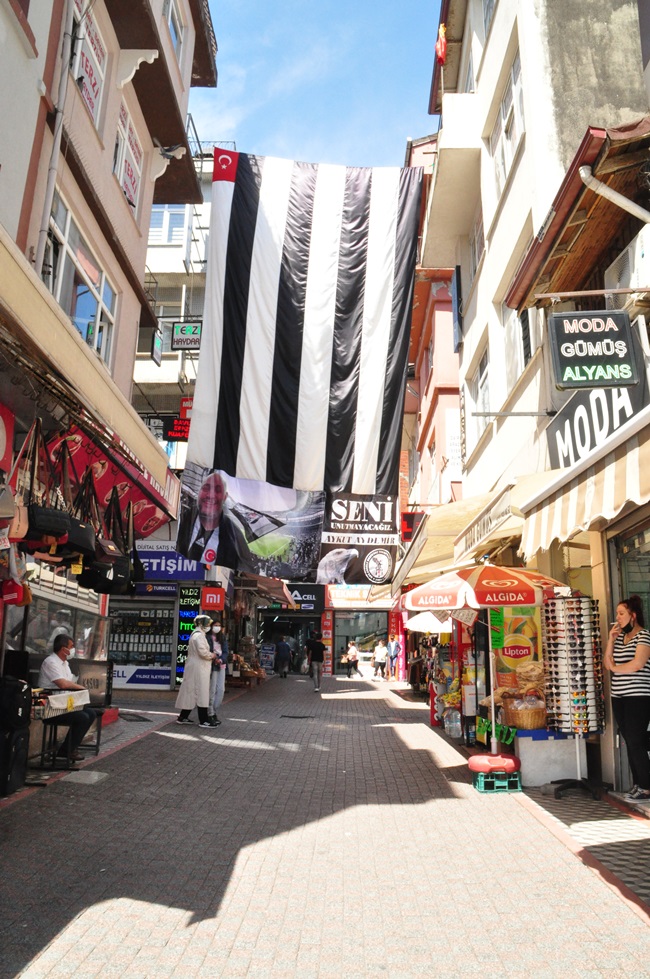 Karadeniz Ereğli şehir merkezinin en işlek caddelerinden biri olan Uzun çarşıya dev Beşiktaş bayrağı asıldı.