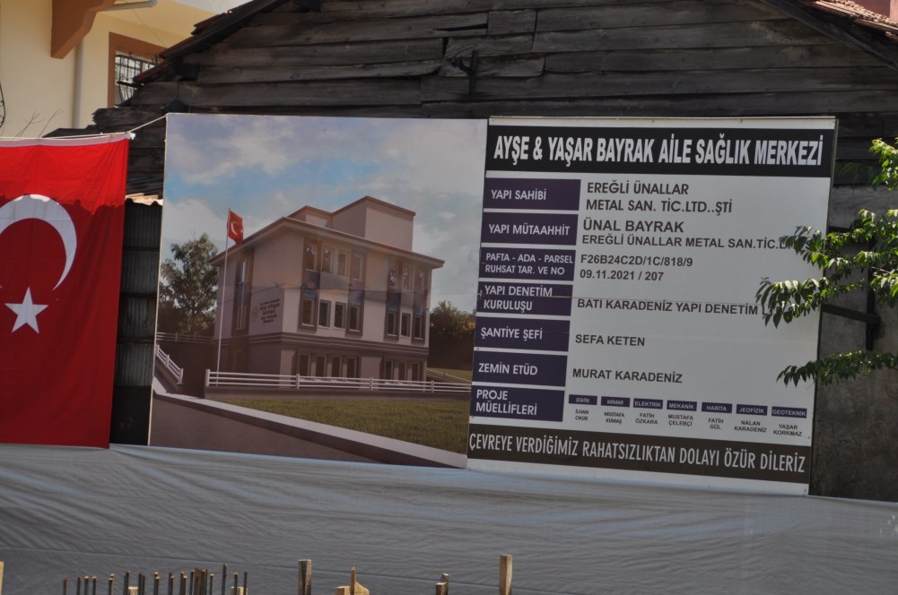 Hayır sever Bayrak Ailesi tarafından Elmatepe Mahallesi'ne yapılacak olan Ayşe-Yaşar Bayrak Aile Sağlığı Merkezi'nin temeli Zonguldak Valisi Mustafa Tutulmaz, Karadeniz Ereğli Kaymakamı Mehmet Yapıcı, Karadeniz Ereğli Belediye Başkanı Halil Posbıyık, İl Sağlık Müdürü Halil Güner’in yanı sıra protokol üyeleri tarafından atılarak yapımına başlandı.