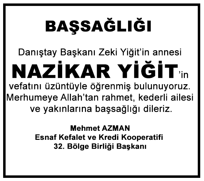 Esnaf Kefalet ve Kredi Kooperatifi 32. Bölge Birliği Başkanı Mehmet Azman Danıştay Başkanı Zeki Yiğit’in annesi Nazikar Yiğit’in vefatı dolayısıyla başsağlığı mesajı yayınladı.