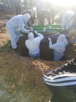 Zonguldak’ın Ereğli İlçesinde, Covid-19’a bağlı salgın sonrası tedavi gördüğü hastanede 75 yaşında yaşamını yitiren kamyoncu esnafı Abdullah Özcan Erdin, toprağa verildi.,