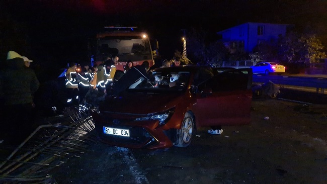 İddiaya göre, 81 DC 034 plakalı otomobilin sürücüsü M.T., yol çalışması nedeniyle kapalı olan yolu fark etmeyerek ilerledi. Otomobil beton dökülecek yola konulan demir yığınına çarptı. Çarpmanın etkisiyle demir yığını önce otomobile ardından sürücünün arkadaşı Gökberk Y.’ye saplandı. İhbar üzerine bölgeye polis, sağlık ve itfaiye ekipleri sevk edildi.
