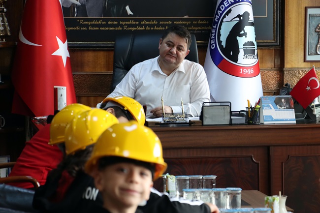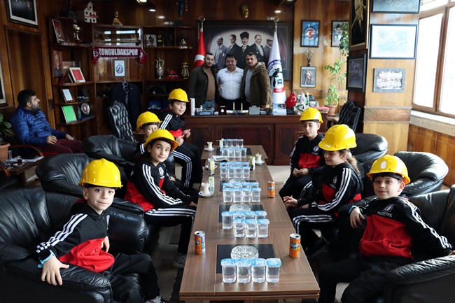 Genel Maden İşçileri Sendikası (GMİS) Genel Başkanı Hakan Yeşil, kendisini ziyarete gelen Kilimli Badminton Takımı sporcularına madenci bareti hediye etti.