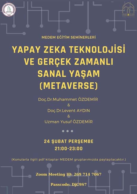 Belli peridolar dahilinde merak edilen, gündemde olan konular zoom üzerinden alanında uzman bilim insanlarının katkılarıyla ele alınmaya bahar döneminde de devam edecek. Bu seminerlerden ilki 24 Şubat 2022 Perşembe akşamı saat 21.00’da Doç. Dr. Muhammet Özdemir, Doç. Dr. Levent Aydın, Uzman Yusuf Özdemir’in sunumuyla gerçekleştirilecek. Hocalar görsel malzemeler eşliğinde son zamanların en çok gündemde olan konusu “Yapay Zekâ Teknolojisi ve Gerçek Zamanlı Sanal Yaşam (Metaverse)” konusunu ele alacaklar.