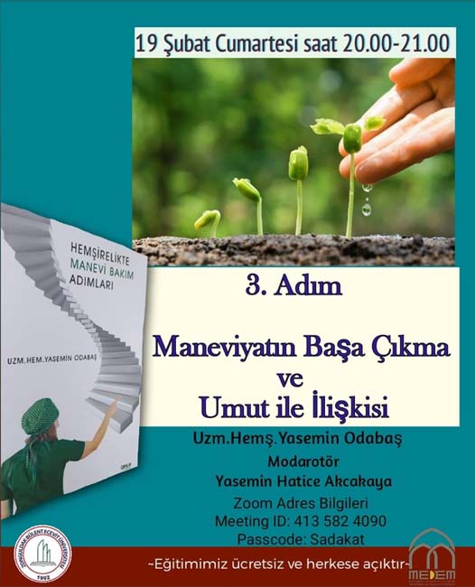 Zoom üzerinden sürdürülen derslerden biri de Yasemin Odabaş tarafından yürütülen “Manevî Bakım Eğitimi Dersleri”. Moderatörlüğünü Yasemin Hatice Akçakaya’nın yaptığı görsel sunum eşliğindeki “Manevi Danışmanlık Dersleri’ her hafta yoğun ilgi görüyor.