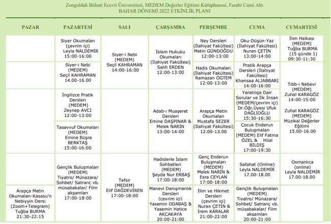 Bülent Ecevit Üniversitesi Medeniyet Araştırmaları ve Değerler Eğitimi Uygulama Araştırma Merkezi (MEDEM) 2021-2022 eğitim öğretim yılı için etkinlik takvimi oluşturdu. Haftalık çalışmalara yer verilen takvimde bu yıl da birbirinden önemli ve faydalı faaliyetler programda yer alıyor.