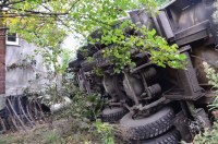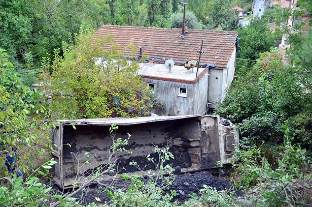 Zonguldak'ta sürücüsünün direksiyon hakimiyetini kaybettiği kamyon, 5 metre yükseklikten bir evin bahçesine uçtu. Gürültüyü deprem sanıp sokağa fırlayan ev sahipleri ise yaşadıkları şoku bir süre üzerlerinden atamadı.