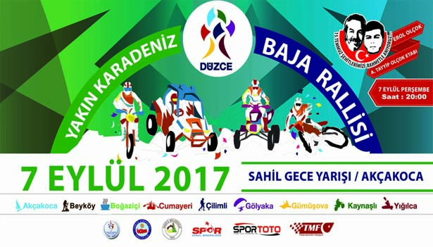 Baja Rallisi bugün Akçakoca Çuhallı Plajı'nda gerçekleşiyor. Akçakoca'da 7 Eylül 2017 Perşembe (Bugün) Sahil Gece Yarışı yapılacak.