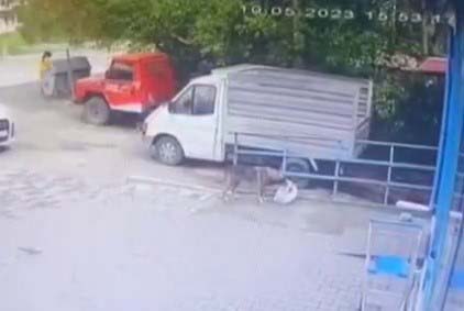 Zonguldak'ta bir köpek, marketin önüne sahibinin poşetle bıraktığı tavuğu alarak uzaklaştı. O anlar güvenlik kamerasına yansıdı.