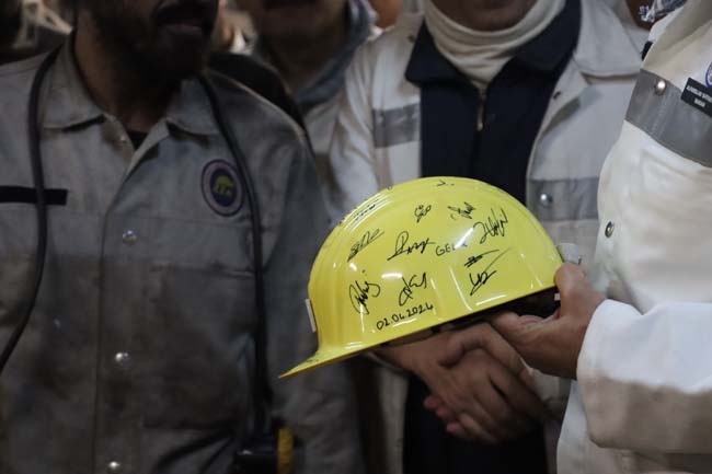 İftarın ardından işletme önünde madencilerle çay içerek sohbet eden Bakan Bayraktar'a maden işçilerinin imzaladığı baret hediye edildi.
