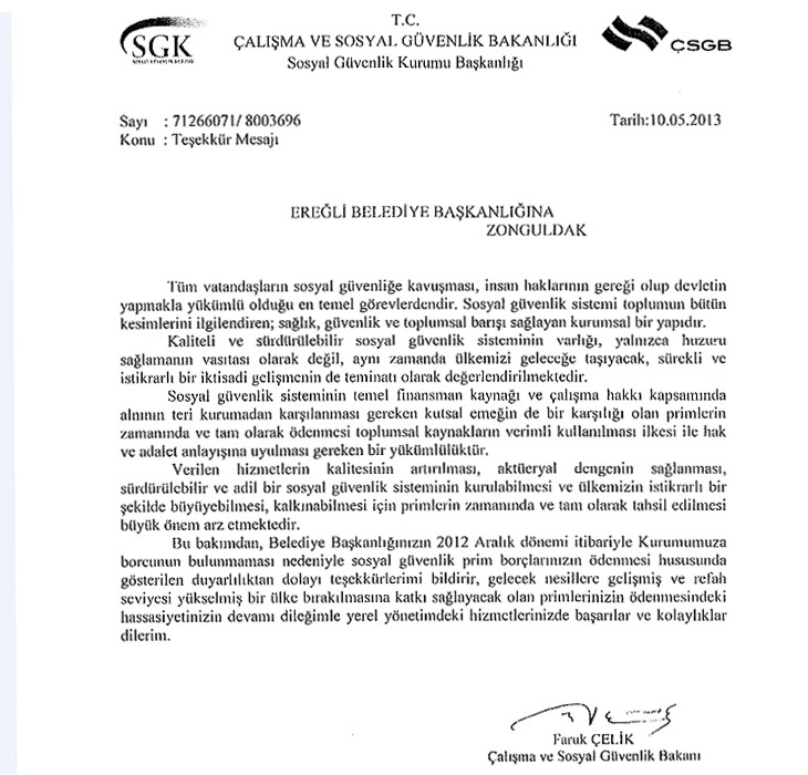 Çalışma ve Sosyal Güvenlik Bakanı Faruk Çelik, Kdz. Ereğli Belediye Başkanlığı'na Sosyal Güvenlik Kurumu (SGK)'na borcu olmadığından dolayı teşekkür yazısı gönderdi.