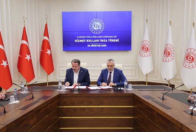 Çalışma ve Sosyal Güvenlik Bakanlığı başkanlığında hizmet kollarında yapılan anlaşmaya ilişkin imza töreni gerçekleştirildi. Törende konuşan Çalışma ve Sosyal Güvenlik Bakanı Vedat Işıkhan, sendikaların binden fazla talebi olduğunu belirterek, "Bu talepleri tasnif ettik. Siz sendika temsilcileri yoğun bir şekilde çalıştınız, Kamu İşveren Heyeti de yoğun bir mesai harcadı. Burada gerçekten de Saygıdeğer Cumhurbaşkanımızın liderliğinde Türkiye Yüzyılı’na yakışan bir çalışma hayatında kamu personelimizi güçlendirecek hem mali hem de sosyal hakları hayata geçirmiş olduk. Ben emek gösteren, destek veren -dün gece 01.30 gibi bitirdik toplantılarımızı- bu toplantılara katılan tüm arkadaşlarıma, hepinize teşekkür etmek istiyorum. Kamu Görevlileri Hakem Kurulundan çıkacak genele ilişkin artış oranları kararının da şimdiden hayırlı olmasını diliyorum" diye konuştu.
