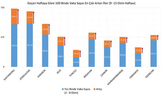 Sağlık Bakanı Fahrettin Koca ayrıca 9-15 Ekim arasında vaka yoğunluğu bir önceki haftaya göre en çok artan 10 ilimizi de açıkladı.