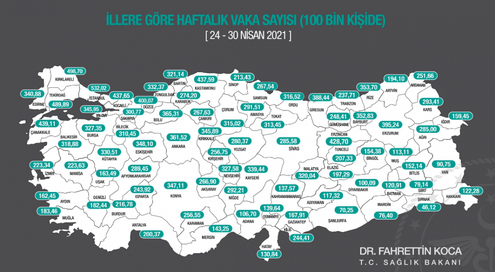 Bakan Koca’nın paylaştığı haritada 24-30 Nisan 2021 tarihli vaka sayısı tablosu şu şekilde oluştu: