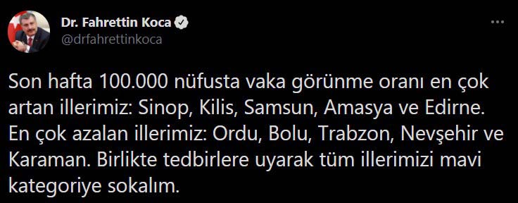 Sağlık Bakanı Fahrettin Koca, resmi sosyal medya hesabından 100 bin nüfusta vaka görünme oranı çok artan ve azalan illeri açıkladı. Bakan Koca yaptığı paylaşımda, “Son hafta 100 bin nüfusta vaka görünme oranı en çok artan illerimiz: Sinop, Kilis, Samsun, Amasya ve Edirne. En çok azalan illerimiz: Ordu, Bolu, Trabzon, Nevşehir ve Karaman. Birlikte tedbirlere uyarak tüm illerimizi mavi kategoriye sokalım” ifadelerini kullandı.