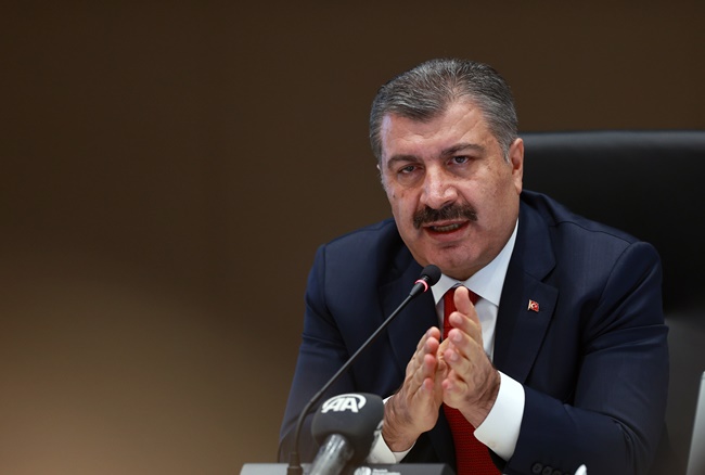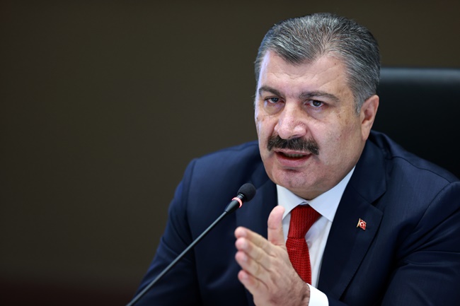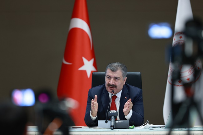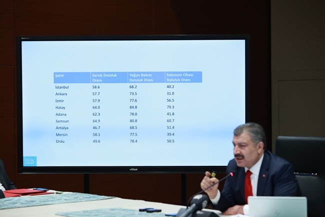 “Havaların soğuması, insanların kapalı ortamda kalması çok hızlı bir alevlenmeyi yüz yüze getirdi. Test kapasitemizi artırdık. Bugün itibariyle toplam test sayısı 20 milyonu buldu. Pozitif vaka sayışımız 1.5 milyonu aştı. 15 bine vatandaşımızı kayıp verdik. Ülkemiz de bundan önceki nisan ayına göre günlük vakasında 5 kattan fazla vefatlarda yüzde 55 artış var. Durumu kritik illerden başlayarak valilerimiz sağlık müdürlerimiz ve halk sağlığı başkanlarımızla her gün online görüşüyor ve durumu yakından takip ediyoruz. Filyasyon ekiplerimizi artırıyor personel ve araç yönünden destekliyoruz. Bu illerin umumi hıfzıssıhha kurullarının gerekli ek tedbirlerin alınmasını sağlıyoruz. İhtiyaç gördüğümüz zamanlarda ulusal kaynaklarımız harekete geçirip test laboratuvar hastanelerimizin alt yapısını güçlendiriyor. Yoğun bakım araç ve gereçlerimizi temin ediyoruz. Sağlık çalışanlarımızın nasıl bir yükün altında olduğunu biliyorsunuz görüyorsunuz. Hastanelerimiz sağlık çalışanlarımız gittikçe artan bir yükü göğüslemenin çabalamanın içinde yoğun bakımda hastalarımız çok yoğun bir savaş veriyor.”