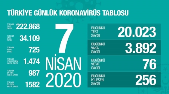 Bakan Koca: 'Son 24 saatte 76 vatandaşımız hayatını kaybetti. Hayatını kaybedenlerin sayısı 725 oldu. 20 bin 23 test yapıldı, 3 bin 892 vaka tespit edildi''.