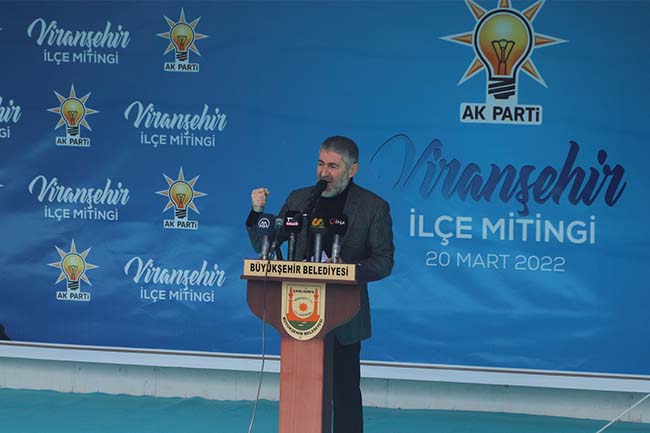 Memleketi Viranşehir ilçesi Cumhuriyet Meydanı'nda düzenlenen mitingde konuşan Hazine ve Maliye Bakanı Nureddin Nebati, kente yatırımların devam edeceğini, hiç kimsenin bu ülkede yatırım yapacak girişimcilerin önünü kesip engel koyamayacağını vurguladı. Bakan Nebati, "Yatırımcımızın önünü kesenlerle mücadele etmeyi biliriz. Bürokratik engeller çıkaranların önünde biz duracağız. Sayın Cumhurbaşkanımızın bürokratik oligarşiye olan savaşında en önde giden akıncılar olarak bizi görebilirsiniz. Bu engellerin önünde biz dururuz. Gerek kamu-özel iş birliği projeleriyle, gerek doğrudan yatırımlarla biz bunu yapacağız" dedi.