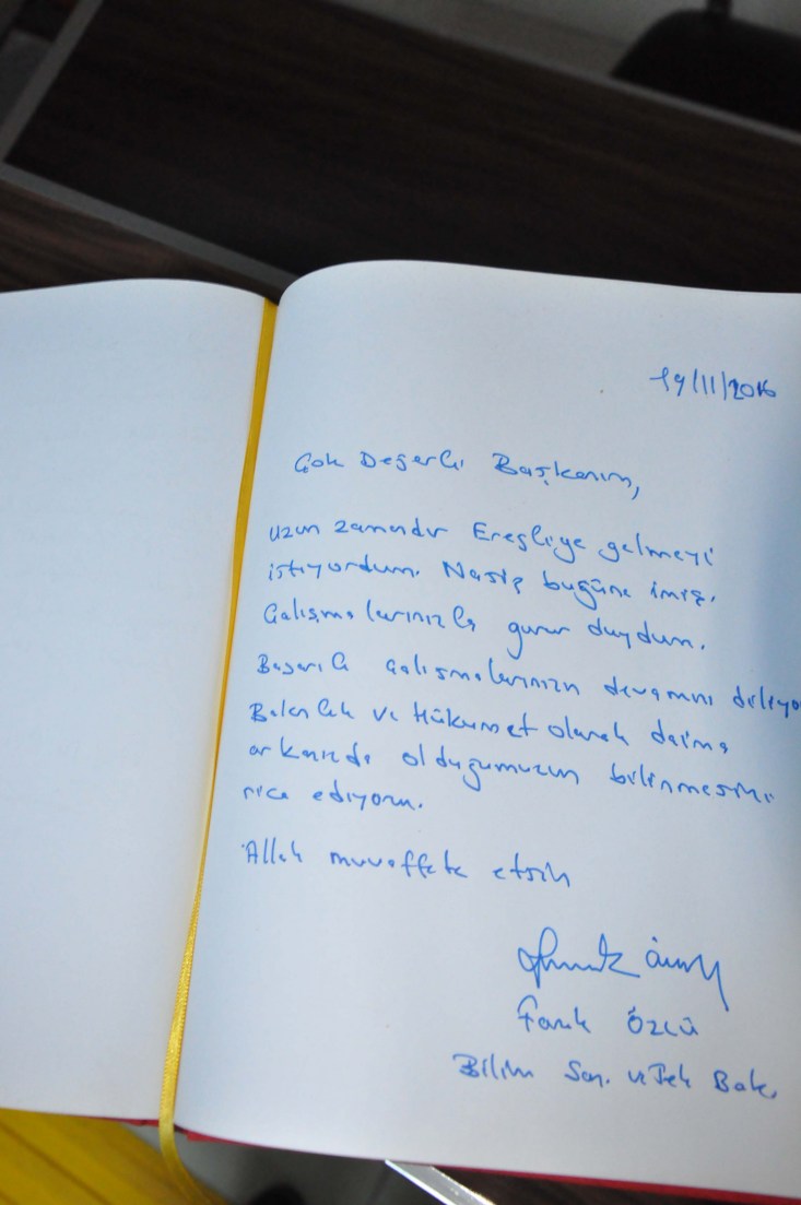Bakan Özlü, açıklamalarının ardından Kdz:Ereğli Belediye Başkanlığı anı defterini imzaladı. Bakan Özlü deftere; "Çok değerli başkanım, uzun zamandır Ereğli'ye gelmeyi istiyordum. Nasip bugüne imiş. Çalışmalarınızla gurur duydum. Başarılı çalışmalarınızın devamını diliyorum. Bakanlık ve hükümet olarak daima arkanızda olduğumuzun bilinmesini rica ediyorum. Allah muvaffak etsin" diye yazdı.