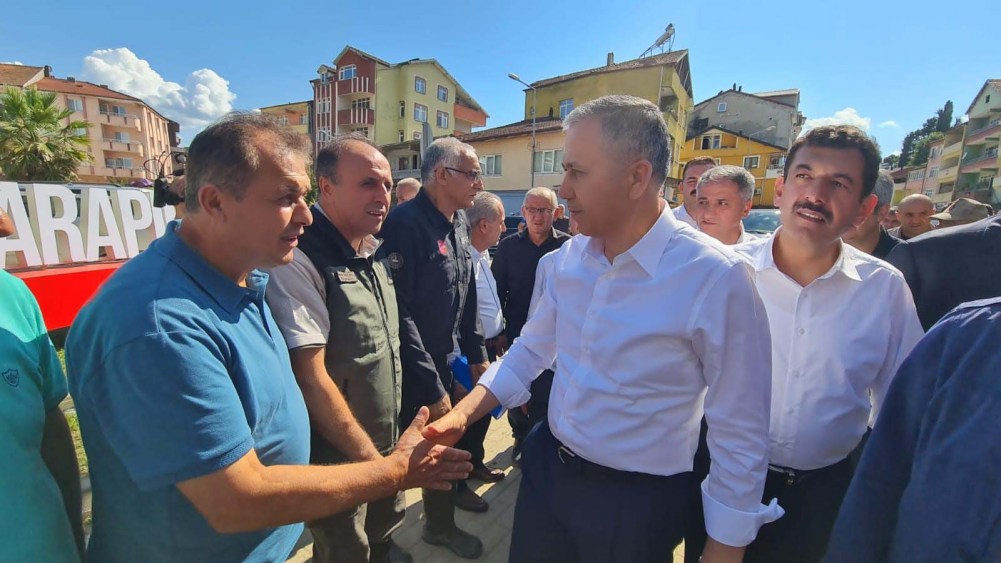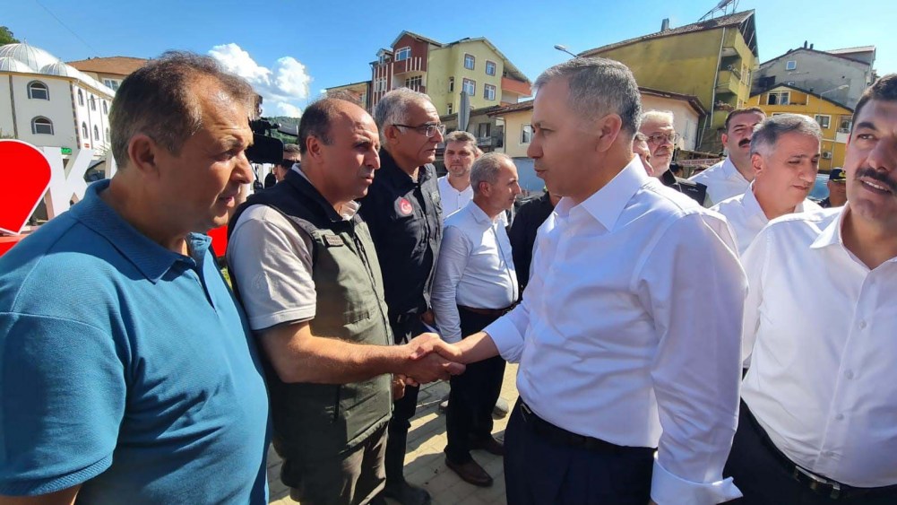 İçişleri Bakanı Ali Yerlikaya, Zonguldak’ta selden etkilenen Çaycuma ilçesine bağlı Karapınar ve Saltukova beldelerinde incelemelerde bulundu. Bakan Yerlikaya, ziyaret ettiği Çaycuma Otobüs Terminali'nde dükkanlarını su basan esnafa geçmiş olsun dileklerini iletti. Daha sonra Çaycuma Kaymakamlığında bir toplantı düzenleyen Yerlikaya, çıkışta gazetecilere yaptığı açıklamada, “Biliyorsunuz cumartesi ve pazar meteorolojinin yaptığı tüm uyarılar doğrultusunda kuvvetli yağış gerçekleşti. Bu yağıştan Batı ve Orta Karadeniz'deki illerimiz olumsuz etkilendiler” dedi.