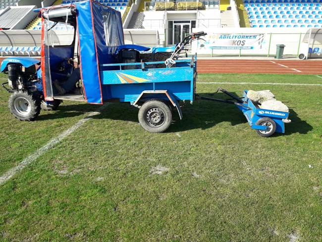 Tesis Sorumlusu Birol Horuzoğlu sahada çim havalandırma ve çimlendirme çalışması yaparak hafta sonu oynanacak 2 önemli karşılaşma için sahayı futbol oynanacak hale getirmek için çalışmalarına devam ediyor.