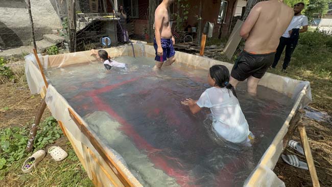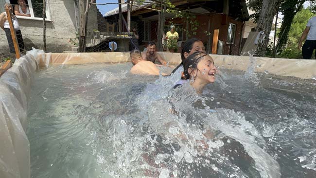 Düzce’de hava sıcaklıkları mevsim normallerinin üzerinde seyredince, serinlemek isteyen mahalle sakinleri bahçeye bin 500 liraya 4 kişilik havuz yaptı.