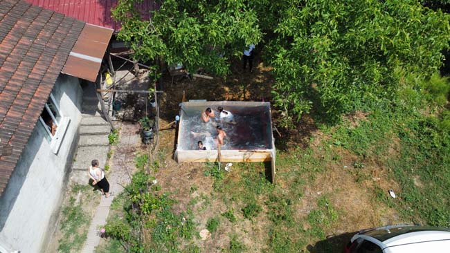Hava sıcaklıklarının her geçen gün arttığı Düzce’de vatandaşlar serinlemek için çeşitli yöntemler bulmaya devam ediyor. Aziziye Mahallesi sakinleri sokak arasında tahta, halı ve naylon kullanarak bin 500 liraya 4 kişinin rahatlıkla girip yüzebileceği havuz yaptı. Denizde boğulma olaylarının sıklıkla duyulması sebebiyle böyle bir şey yaptıklarını vurgulayan Bülent Oylu, "Can sıkıntısı ile hava sıcaklığı birleşince böyle bir şey yaptık. Tahtaları aldık, etrafını kapattık. Altına halı koyduk, daha sonra branda koyduk. Burada 4-5 kişi aynı anda yüzebilir. Toprağın suyu çekmemesi için branda koyduk. Onun üzerine de ayaklarımız veya kafamız yaralanmaması için halı koyduk" şeklinde konuştu.