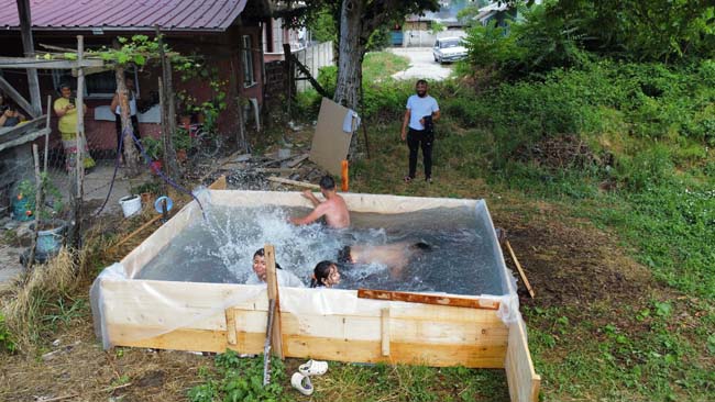 Düzce’de hava sıcaklıkları mevsim normallerinin üzerinde seyredince, serinlemek isteyen mahalle sakinleri kendilerine bakın nasıl havuz yaptılar?