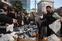 Zonguldak'ta, cadde aralarında balık satan seyyar satıcılara tepki gösteren balık hali esnafı, kaldırıma istiflediği balıkları Zonguldak Belediyesi'ne tepki amacıyla ucuza sattı.