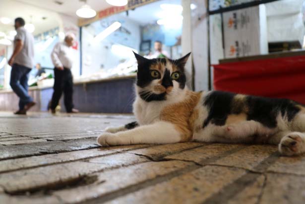 esnafın verdiği balıklar ile karnını doyuruyor. Hale gelen müşterilerin de ilgi