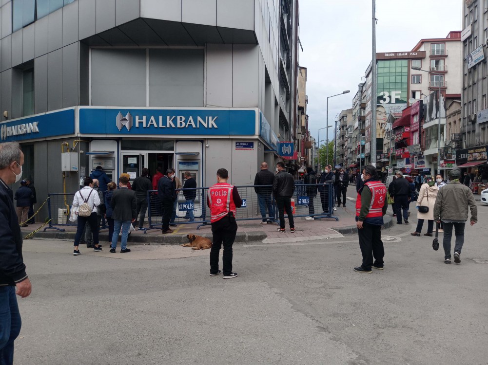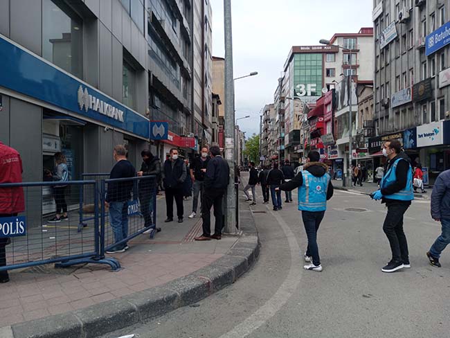 Zonguldak'ta polis ekipleri banka önlerinde sosyal mesafe kuralına uyamayan kişileri uyararak maske takmalarını istedi.