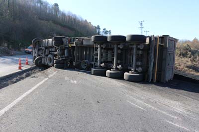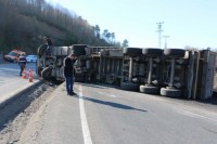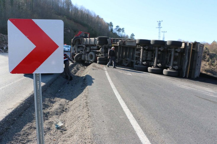 Kaza Zonguldak İstanbul karayolu Kandilli Kavşağı mevkiinde meydana geldi. Alınan bilgilere göre Zonguldak'tan İstanbul' a giden 7 ton toz kömür yüklü 67 AU358 çekici 67 AV 804 Dorse plakalı TIR sürücüsü Cevdet Velioğlu (51), kendisini sollayan otomobile yol açmak için direksiyonu sağa kırınca bankete düştü. Sürücü Velioğlu'nun kontrolünden çıkan tır devrilerek sürüklenmeye başladı. Yaklaşık 20 metre sürüklenen TIR, yol ortasında ki su kanalına düşerek durdu. Kazayı gören diğer sürücüler kazada yaralanan TIR sürücüsü Velioğlu'nun yardımına koşarken sağlık ekiplerine de haber verdi. Olay yerine gelen 112 ekipleri yaralı sürücüye ilk müdahaleyi yaptıktan sonra Ereğli devlet hastanesine kaldırdı. Kazada hafif yaralanan sürücü Cevdet Velioğlu'nun sağlık durumunun iyi olduğu öğrenildi. Kazada çevreye dağılan kömürü toplamak için iş makinesi çağırılırken, kapanan yol nedeniyle trafik tek şeride düşürülen yoldan verildi. TIR'ın yoldan vinç yardımı ile kaldırılacağı öğrenildi. Polis ve Jandarma ekipler yolda güvenlik önlemi alırken, kaza ile ilgili tahkikat başlatıldı.
