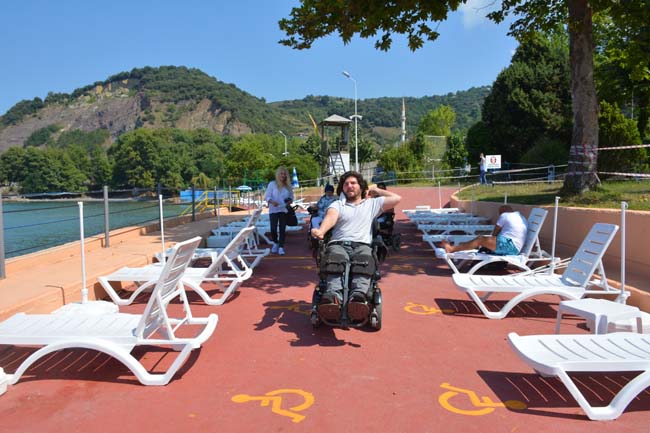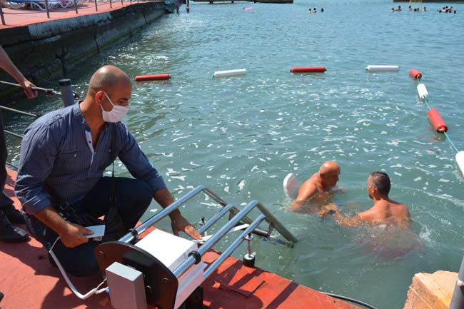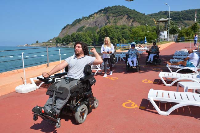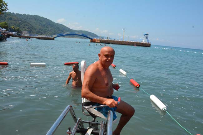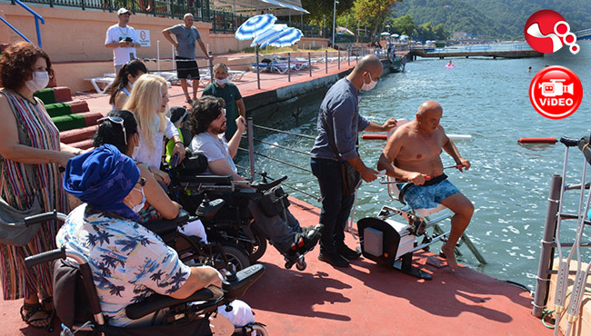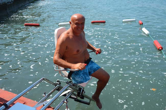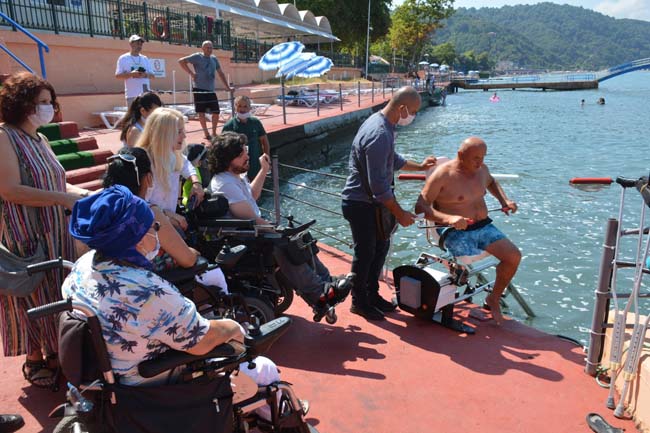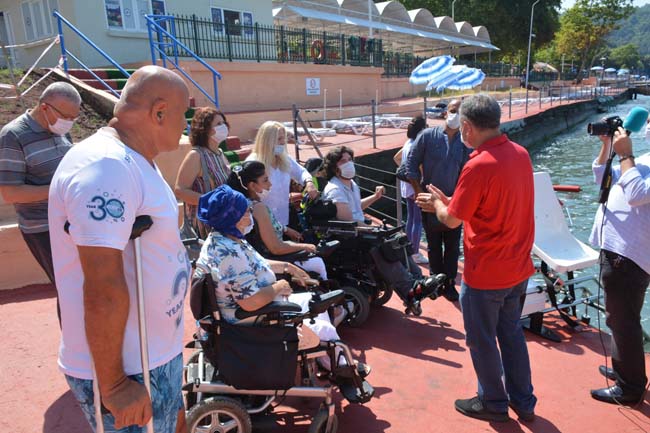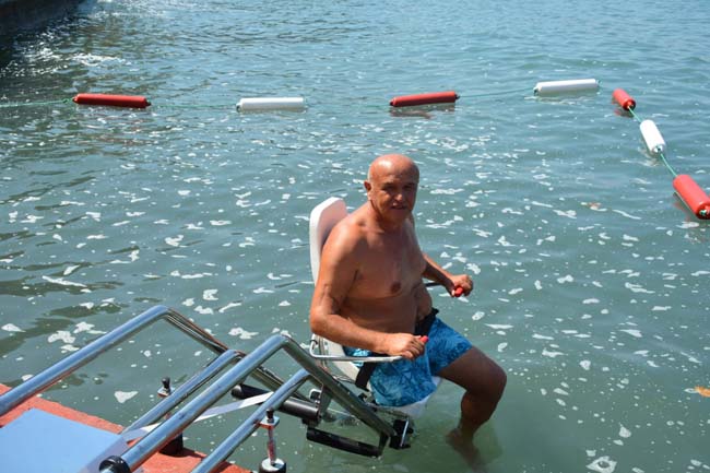 Sevgi, Barış, Dostluk Plajı ve Mesire Alanı Koordinatörü Namık Şahin, Sosyal Hizmetler Müdürü İsmail Başel, engelli bireyler ve aileleriyle birlikte montajı tamamlanan asansör sisteminin ilk denemesini yaptılar. Engelli yüzücü gazi Recep Ateş, asansörle denize girerek yüzdü, sistemi test etti.