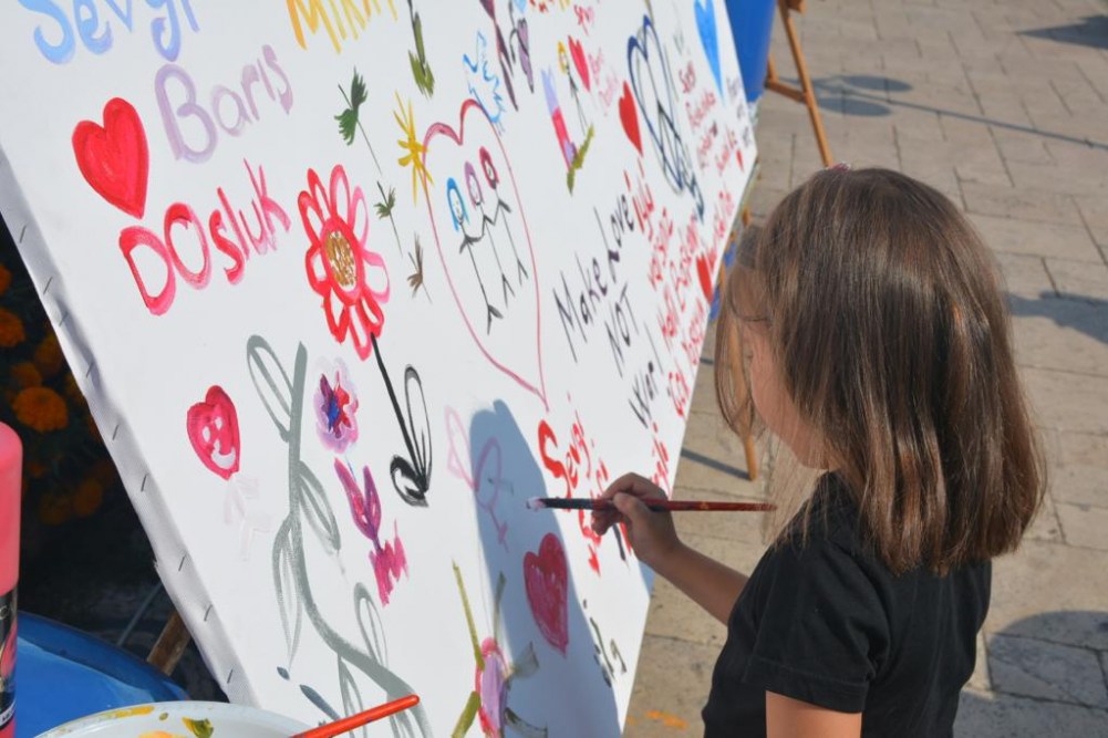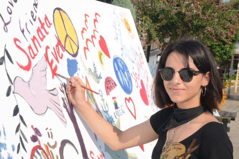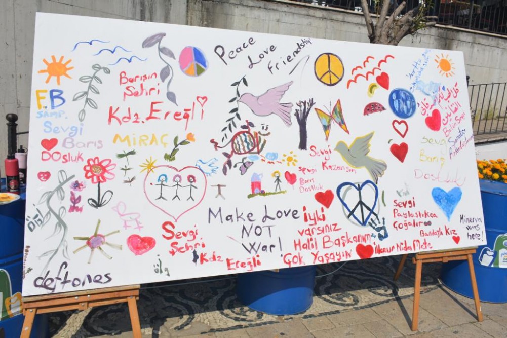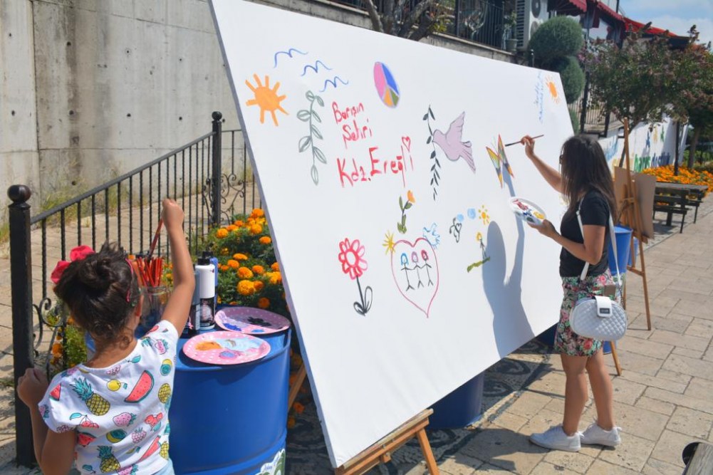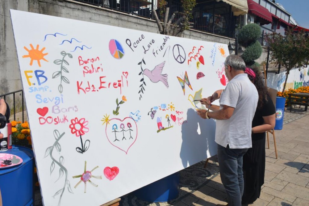 Kdz. Ereğli Belediyesi ve Ressam Mehtap Akdemir Sanat Atölyesi Kursiyerleri işbirliği ile düzenlenen 1 Eylül Dünya Barış Günü Etkinliği, Yalı Caddesi Ruhi Cöbekoğlu Üst Geçidi altında gerçekleştirildi. Sanatçıların çalışmaları ve 7'den 70'e Ereğli halkının ellerinde fırça, "Barış Tuvali"nde verdiği mesajlar çok çarpıcıydı.