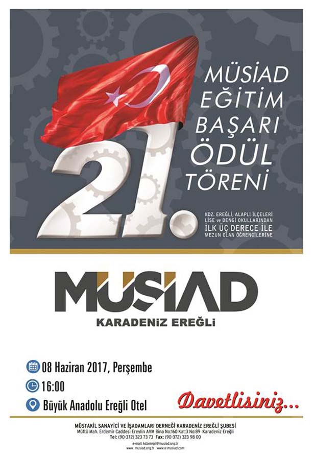 MÜSİAD Karadeniz Ereğli Şubesi tarafından, yapılan açıklamada; her sene geleneksel olarak Karadeniz Ereğli ve Alaplı ilçeleri Lise ve Dengi Okullarından ilk üç dereceyle mezun olan öğrencilerin ödüllendirilmesi amacıyla düzenlenen MÜSİAD Eğitim Başarı Ödül Töreni Programı'nın 21.'si düzenleneceği belirtildi.