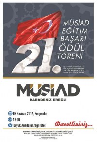 Müstakil Sanayici ve İş Adamları Derneği (MÜSİAD) Karadeniz Ereğli Şubesinin geleneksel hale getirdiği ve bu yıl 21.'sini düzenleyeceği MÜSİAD Eğitim Başarı Ödül Töreni programı yapılacak. 8 Haziran Perşembe günü 16.00-18.30 saatleri arasında Büyük Anadolu Ereğli Otel'de gerçekleştirilecek programa katılımın yüksek olması bekleniyor.